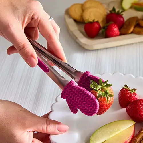 Die Mini Handschuh Zange Berry ist dein cleveres Tool für das präzise Anrichten und sichere Greifen kleiner Stücke. Kompakt in der Hand, mit griffigen Spitzen für verlässlichen Halt – ideal für Gemüse, Fingerfood, Salate, Dessert-Dekore oder Brotscheiben. Die sanfte Greiffläche arbeitet schonend, sodass Teller, Schalen und beschichtete Oberflächen unversehrt bleiben.