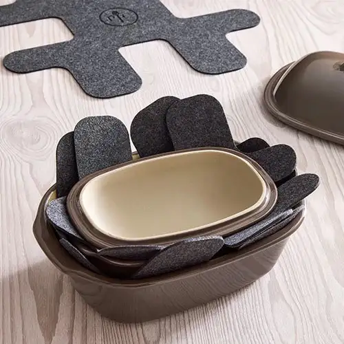 Die weichen, gleichzeitig stabilen Schoner verhindern zuverlässig Kratzer, wenn du dein Kochgeschirr platzsparend stapelst. Sie sind aus einem schmutzabweisenden Material gefertigt und lassen sich bei Bedarf ganz einfach mit einem feuchten Tuch reinigen. Dank ihrer durchdachten rechteckigen Form passen sie nicht nur in runde Pfannen, sondern auch in eckige und quadratische Formen – ideal für alle, die viel Stoneware nutzen.