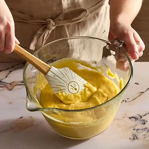 Dank seines frischen Celebration-Looks setzt der Schaber einen dezenten Farbakzent am Arbeitsplatz. Er eignet sich perfekt für Backtage mit Familie und Freunden – von der Teigschüssel bis zur Glasur – und wirkt am Serviertisch ordentlich und professionell. Klein genug für Gläser und Ecken, robust genug für zähere Massen.