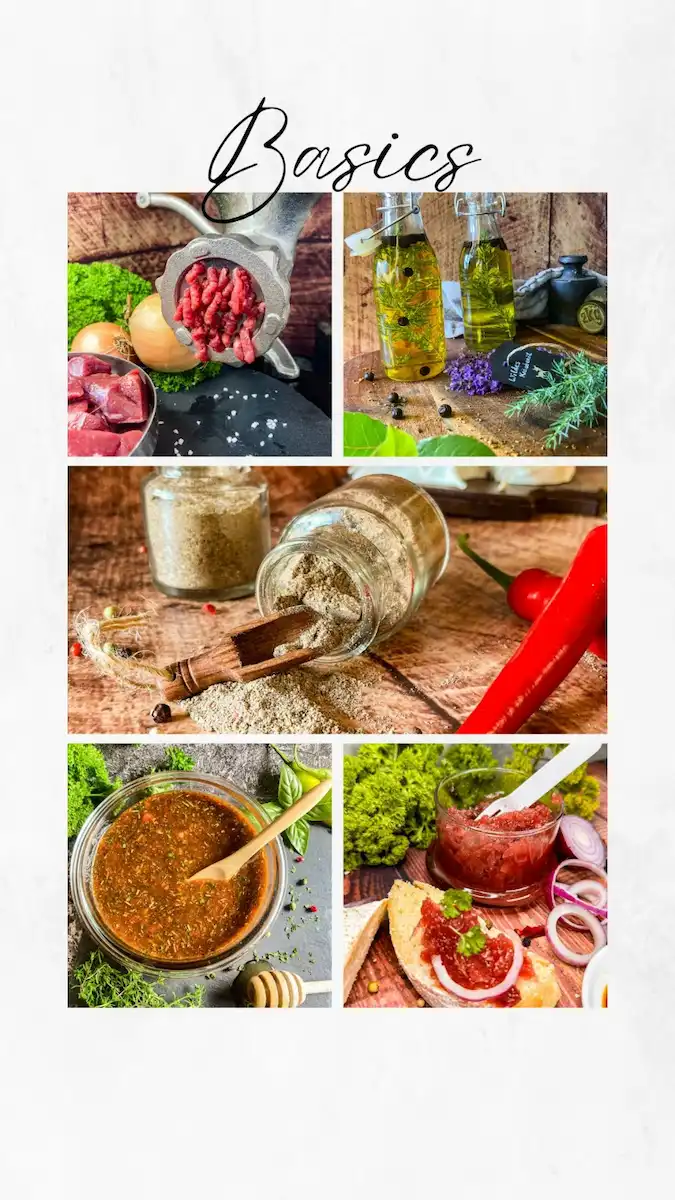 Das Buch startet mit fünf essenziellen Grundrezepten, die als Basis für viele der folgenden Wildgerichte dienen: Ein Hackfleisch Grundrezept, ein aromatisches Wild-Kräuteröl, eine Wild-Marinade, eine Wild-Gewürzmischung sowie eine Rote Zwiebelmarmelade – perfekte Begleiter für nahezu alle Wildgerichte.